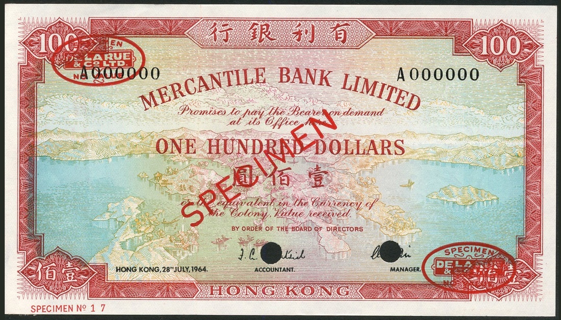 (†) Mercantile Bank Limited, Hong Kong, specimen $100, 28 July 1964, serial number A000000, red, pale blue and multicoloured, view of Hong Kong at centre, value at centre and at each corner, reverse red and pale orange, maiden at centre, value at each corner