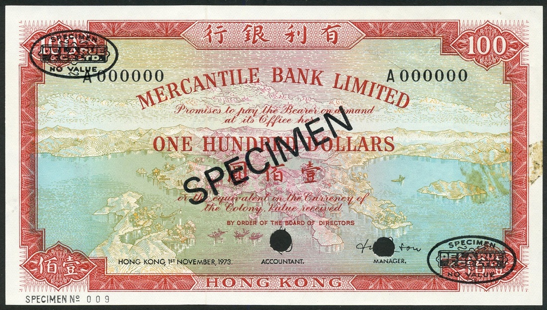 (†) Mercantile Bank Limited, specimen $100, 1 November 1973, serial number A000000, red, pale blue and multicoloured, view of Hong Kong at centre, value at centre and at each corner, reverse red and pale orange, maiden at centre, value at each corner