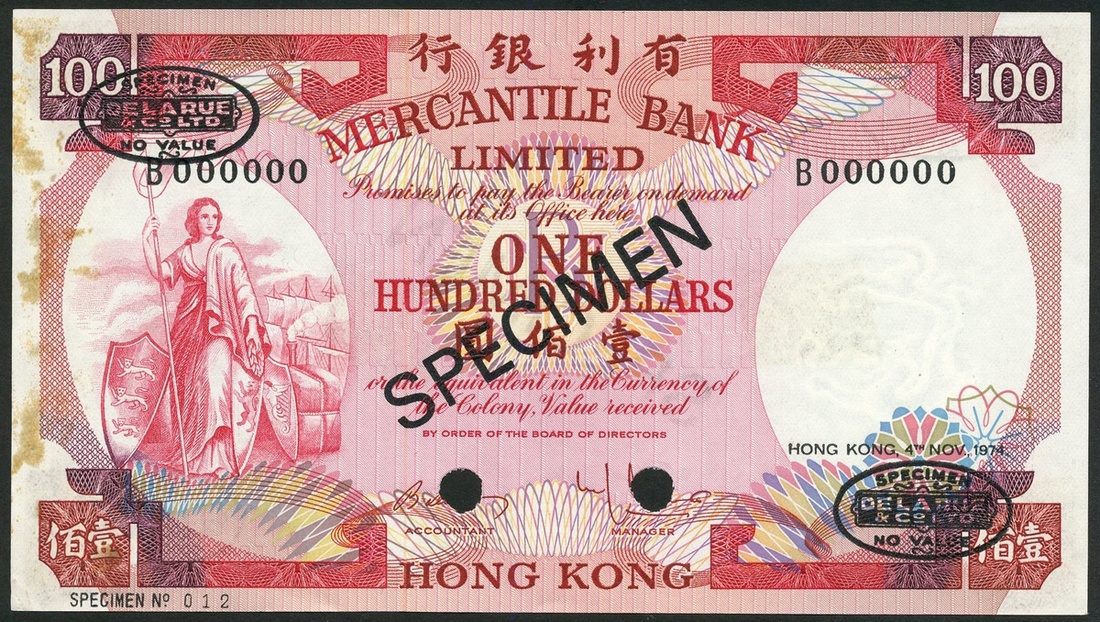 (†) Mercantile Bank Limited, specimen $100, 4 November 1974, serial number B 000000, red and multicoloured, maiden at left, reverse red, view of Hong Kong
