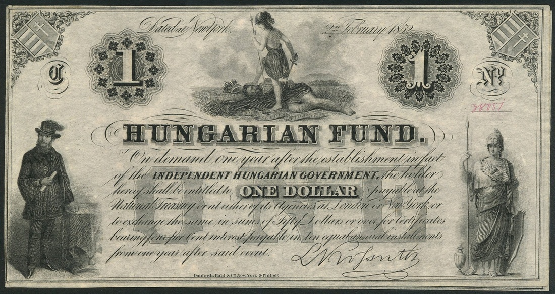 Hungarian Fund, $1 (11), 2 February 1852, red consecutive serial numbers 28051-28061, black and white, L. Kossuth at low left, Liberty at right, Hungaria at top centre