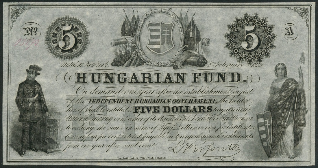 Hungarian Fund, $5 (11), 2 February 1852, serial letter A, consecutive numbers 13273-13283, black and white, black and white, L. Kossuth at low left, Liberty at right, arms at top centre