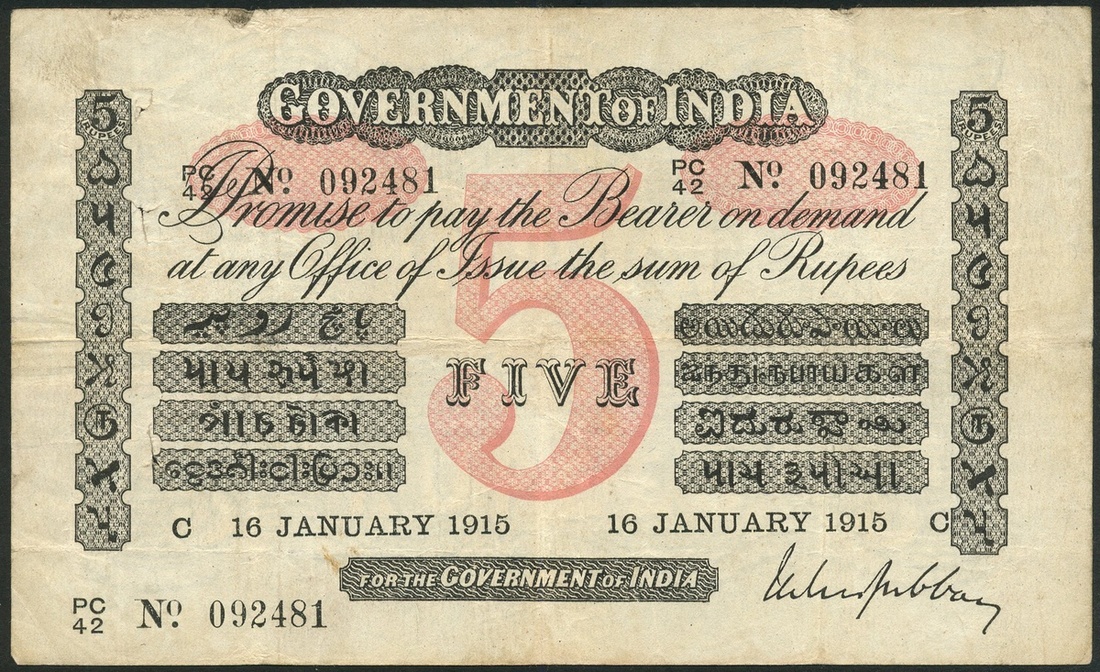 Government of India, 5 rupees, Bombay, 8 April 1915, prefix MC/91, black and white, value in pink underprint at centre, Gubbay signature low right, B in field low left and right, also 5 rupees, Calcutta, 16 January 1915, prefix PC/42, colour and design as previous except C in field
