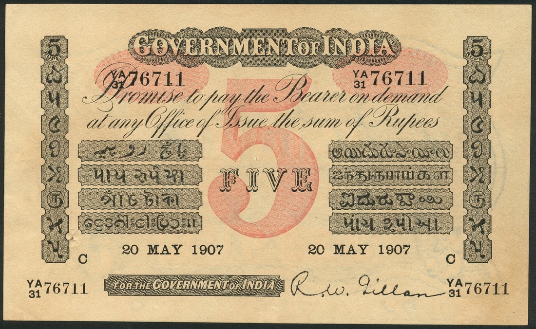 Government of India, 5 rupees, Calcutta, 20 May 1907, serial number YA/31 76711, black and white, value in pink underprint at centre, Gillen low right, C in field low left and right