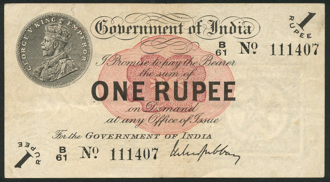 Government of India, 1 rupee, ND (1917), serial number B/61 111407, black and white with a pink-red central guilloche, George V in 1 rupee coin at top left, Gubbay signature
