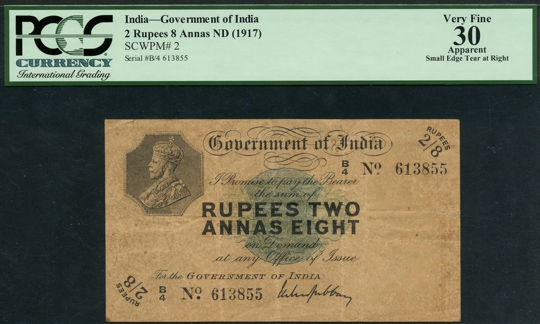 Government of India, 2 rupees 8 annas, ND (1917), serial number B/4 613855, black and green, portrait King George V top left, value low left, centre and top right, Gubbay signature, reverse, GRI with crown above at top left, value top right