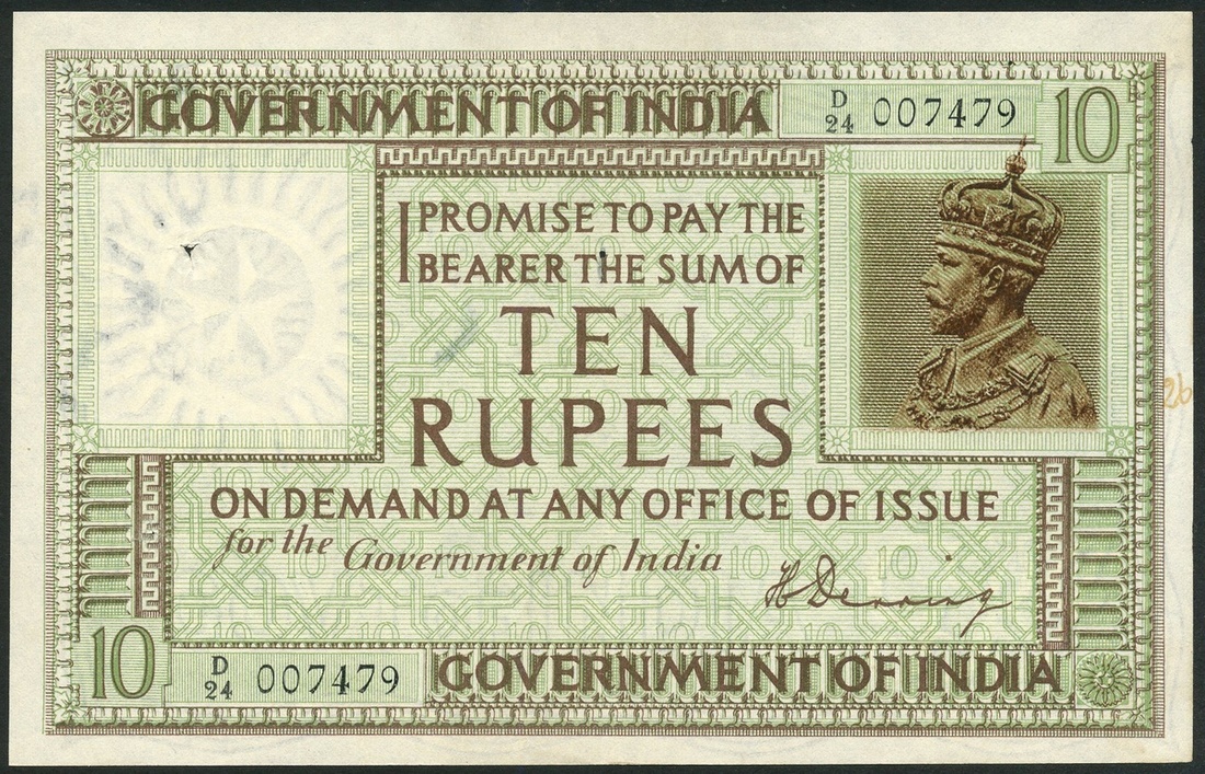 (x) Government of India, 10 rupees, ND (1925), serial number D/24 007497, blue-green, brown and white, George V top right, Denning signature