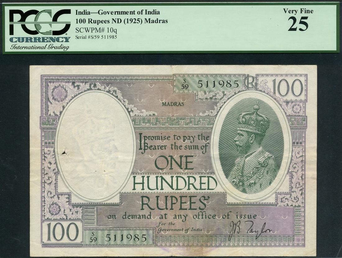 Government of India, 100 rupees, ND (1926), Madras, serial number A/71 987606, purple, green and pale orange, crowned head of George V at right, Taylor signature, reverse green and pale brown