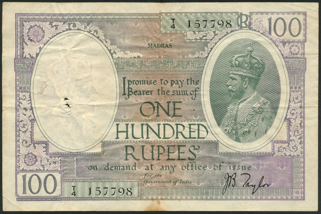 (x) Government of India, 100 rupees, Madras, ND (1927), serial number T/4 157798, green and lilac, crowned portrait of George V at right, Taylor signature, reverse green and lilac, language panel at centre