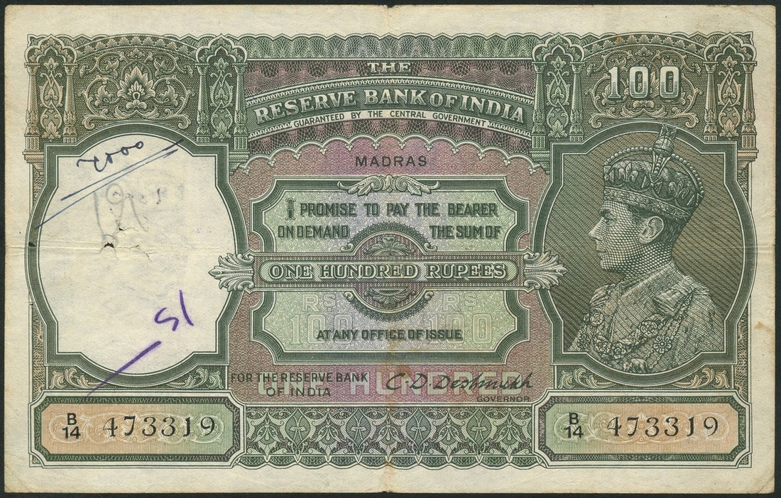 Reserve Bank of India, 100 rupees (2), ND (1938), Bombay and Madras, prefixes A/44, B/14, olive green, portrait King George VI at right, bank title top centre, Taylor and Deshmukh signature respectively, reverse, tiger at centre