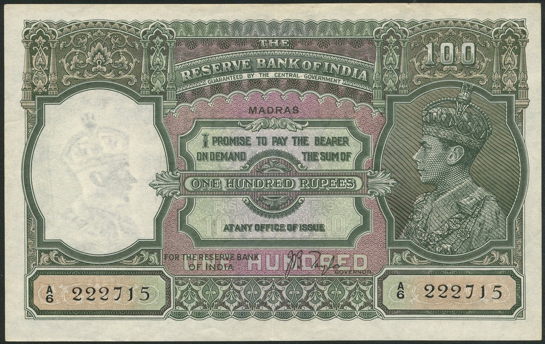 (x) Reserve Bank of India, Madras, 100 rupees, ND (1937), serial number A6 222715, olive green on multicolour underprint, portrait King George VI at right, bank title top centre, ornate border, reverse, tiger at centre