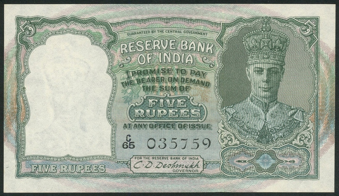 (x) Reserve Bank of India, 5 rupees, ND (1943), black serial number C/65 035759, green and lilac, crowned head of George VI as Emperor at right, Deshmukh signature, reverse green and tan, antelope