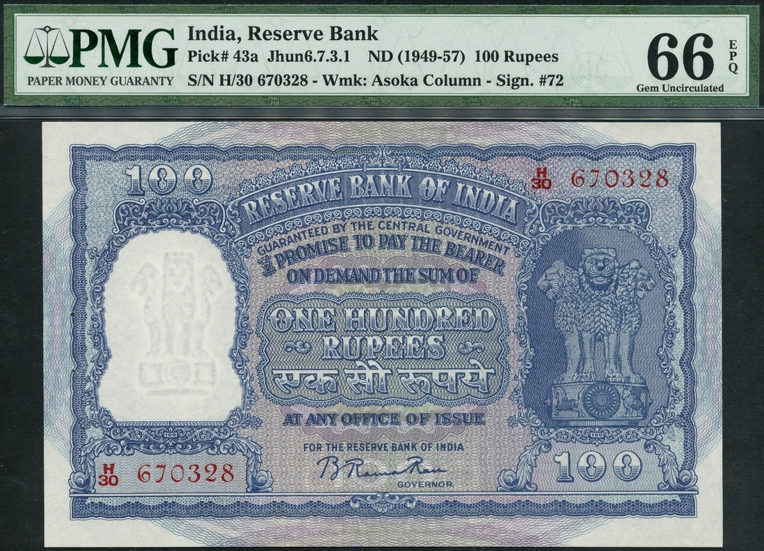 (Pick 43a, Razack-Jhunjhunwalla 6.7.3.1), in PMG holder number 66 EPQ, gem uncirculated