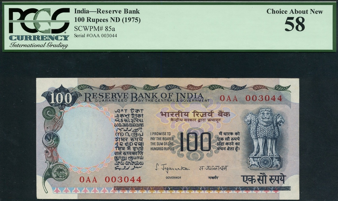 (Pick 85a, Razack-Jhunjhunwalla 6.7.8.1), spindle holes at left otherwise fresh and original, in PCGS holder 58, choice about uncirculated, and a rare low serial number for the first issue