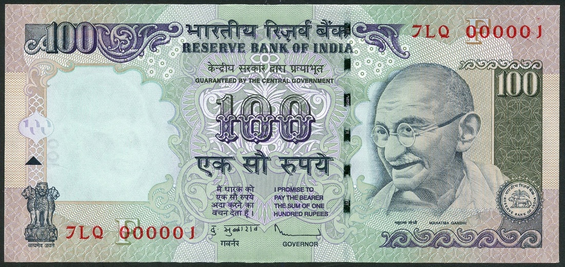 Reserve Bank of India, 100 rupees (10), ND (2010), red serial number 7LQ 000001-000010, violet and green, Gandhi at right