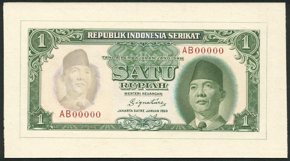 Republik Indonesia Serikat, uniface obverse partially hand-executed essay on card for an unissued 1 Rupiah, Jakarta, January 1950, serial number AB 0000, green, President Sukarno at right, proposed watermark at left, value in all four corners