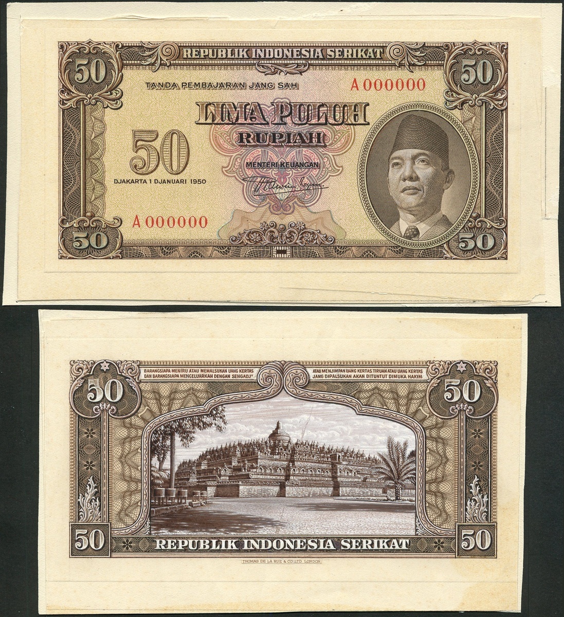 Republik Indonesia Serikat, uniface obverse and reverse partially hand-executed essays on card for an unissued 50 Rupiah, Jakarta, 1 January 1950, serial number A 000000, brown, President Sukarno at right, value at left and in all four corners, reverse temple set in ornate frame