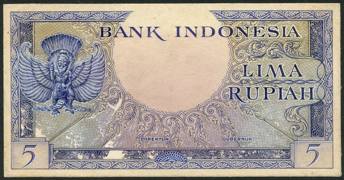 Bank Indonesia, uniface obverse partially hand-executed essay on card for an unissued 5 Rupiah, ND, blue on pale pink underprint, garuda at upper left, value at lower left and lower right