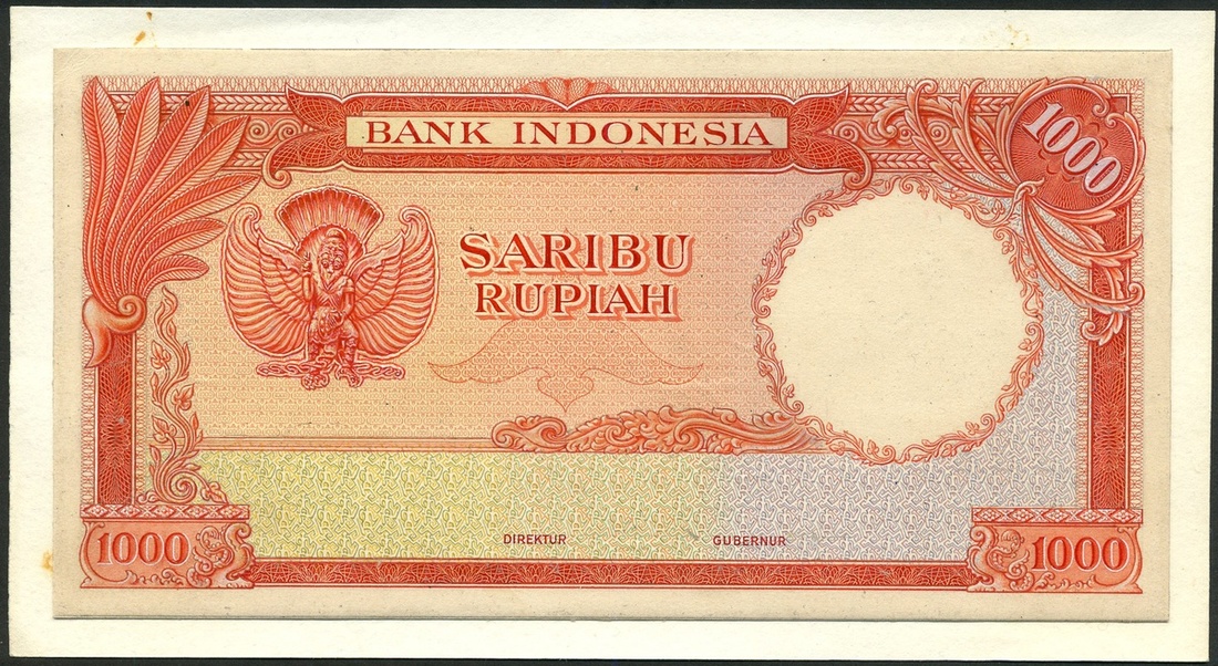 Bank Indonesia, uniface obverse partially hand-executed essay on card for an unissued 1000 Rupiah, ND, red on multicoloured underprint, garuda and scrollwork at upper left, value in ornate frame at upper right
