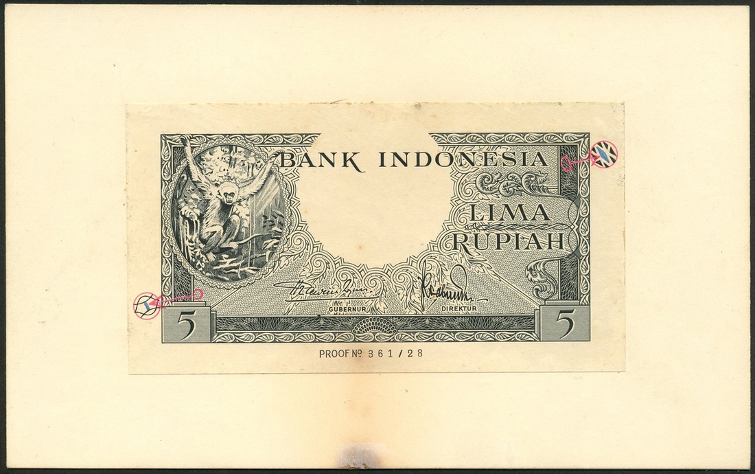 Bank Indonesia, uniface obverse black and white die proof on card, 5 Rupiah, ND (1957), orang-utan in oval at upper left, scrollwork at right, (Pick 49dp),