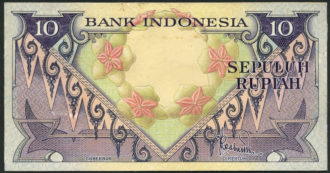 Bank Indonesia, uniface obverse partially hand-executed essay on card, 10 Rupiah, ND (1959), violet and pink on purple and pale green underprint, flowers at centre