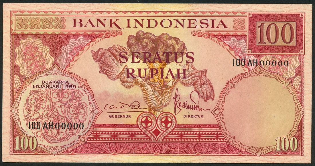 Bank Indonesia, uniface obverse partially hand-executed essay on card, 100 Rupiah, Djakarta, 1 January 1959, serial number 100 AH00000, red and dark brown on multicoloured underprint, Giant Rafflessia flowers at centre, ornate scrollwork at lower left