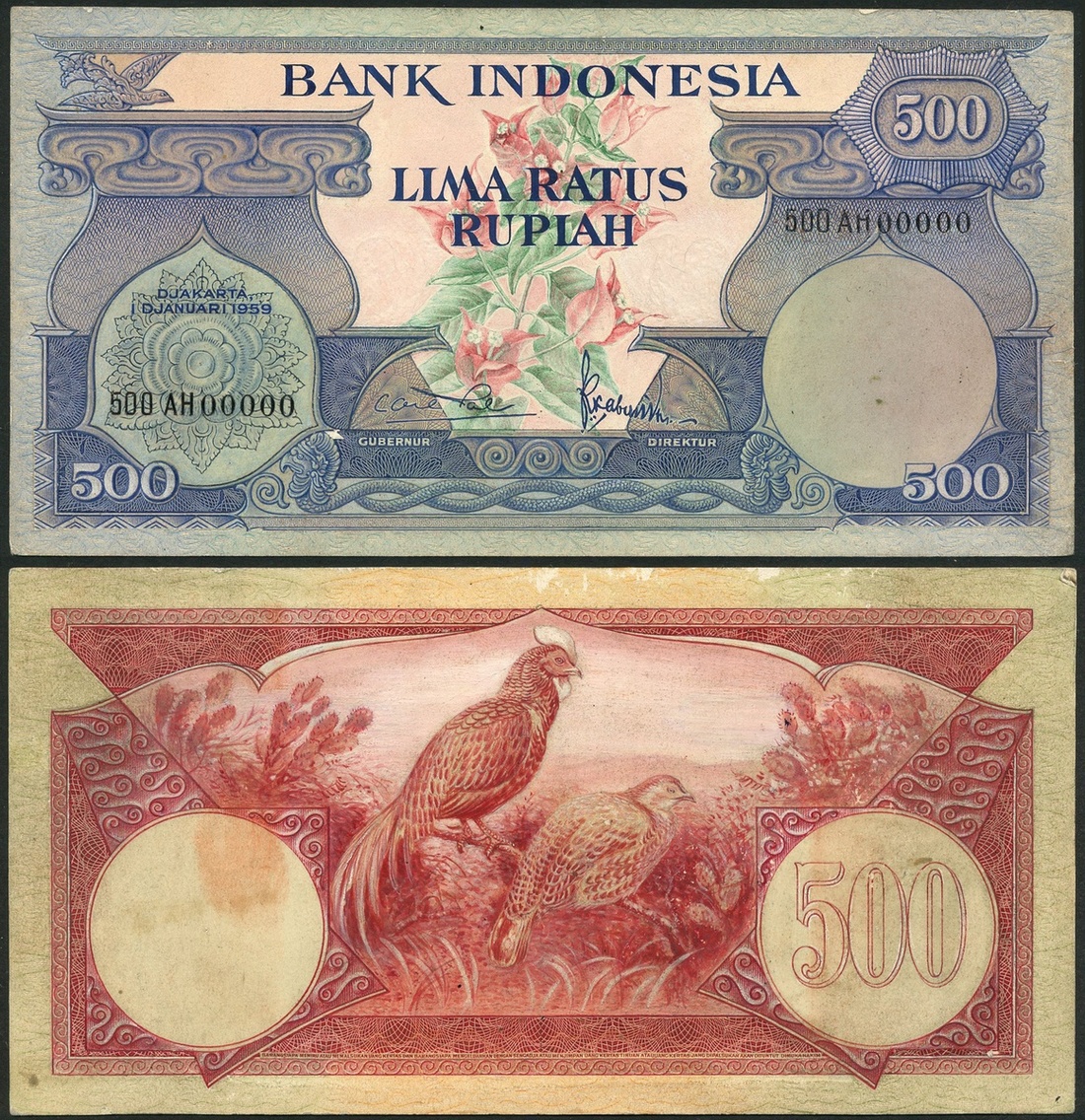 Bank Indonesia, uniface obverse and reverse partially hand-executed essays on card, 500 Rupiah, Djakarta, 1 January 1959, serial number 500 AH00000, blue on multicoloured underprint, flowers at centre, ornate scrollwork at lower left, reverse deep red, Crested Firebacks at centre, value at lower right