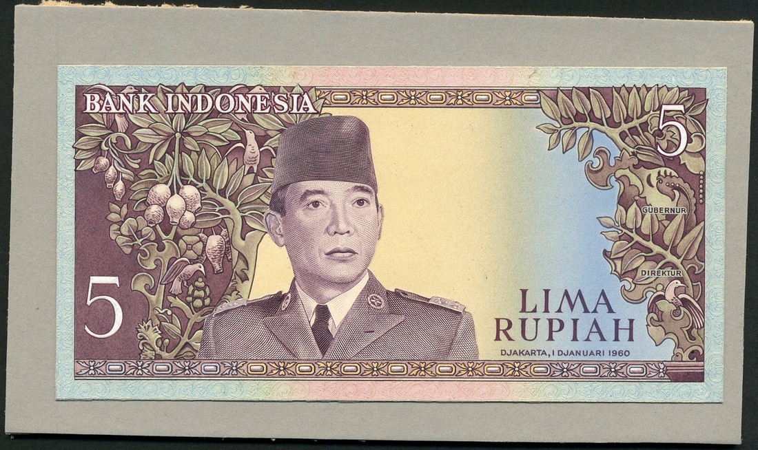 Bank Indonesia, uniface obverse partially hand-executed essay on card for an unissued 5 Rupiah, Djakarta, 1 January 1960, brownish purple on pale blue and multicoloured underprint, President Sukarno at centre left, fruit, branches and birds at left and right, value at upper right and lower left,
