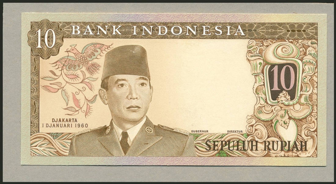 Bank Indonesia, uniface obverse partially hand-executed essay on card for an unissued 10 Rupiah, Djakarta, 1 January 1960, brown on purple and tan underprint, President Sukarno at centre left, bird with foliage at left, value in ornate guilloche at right