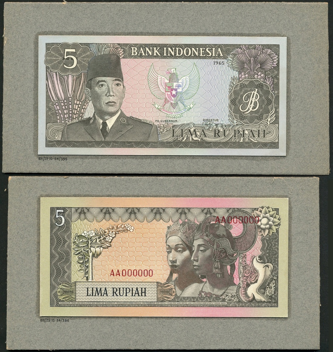 Bank Indonesia, uniface obverse and reverse partially hand-executed essays on card for an unissued 5 Rupiah, 1965, serial number AA000000, grey on pale blue and pink underprint, President Sukarno at left, arms at centre, value at upper left, reverse Javanese dancers at right
