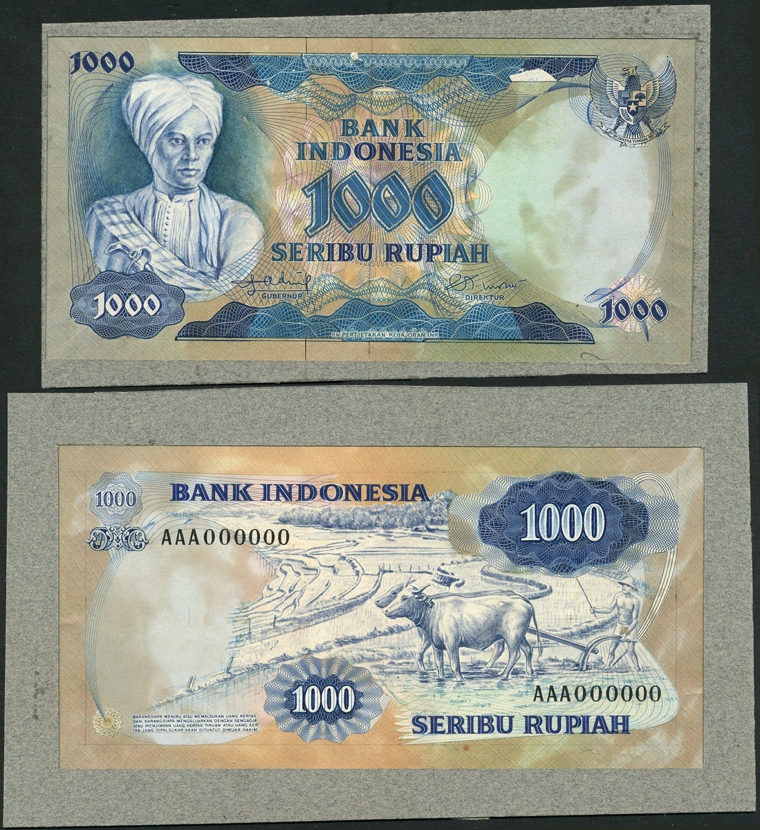 Bank Indonesia, uniface obverse and reverse partially hand-executed essays on card, 1000 Rupiah, ND (1970), serial number AAA 000000, blue-green and blue on multicoloured underprint, Prince Diponegoro at left, arms at upper right, reverse farmer ploughing with oxen in terraced rice fields