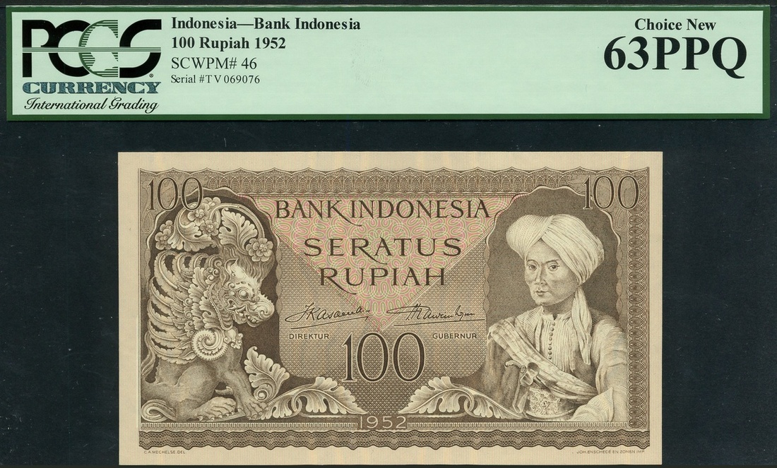 Bank Indonesia, 100 rupiah, 1952, serial number TV069076, brown, Prince Diponegoro at right, mythical lion at left, value at low centre and top left and right