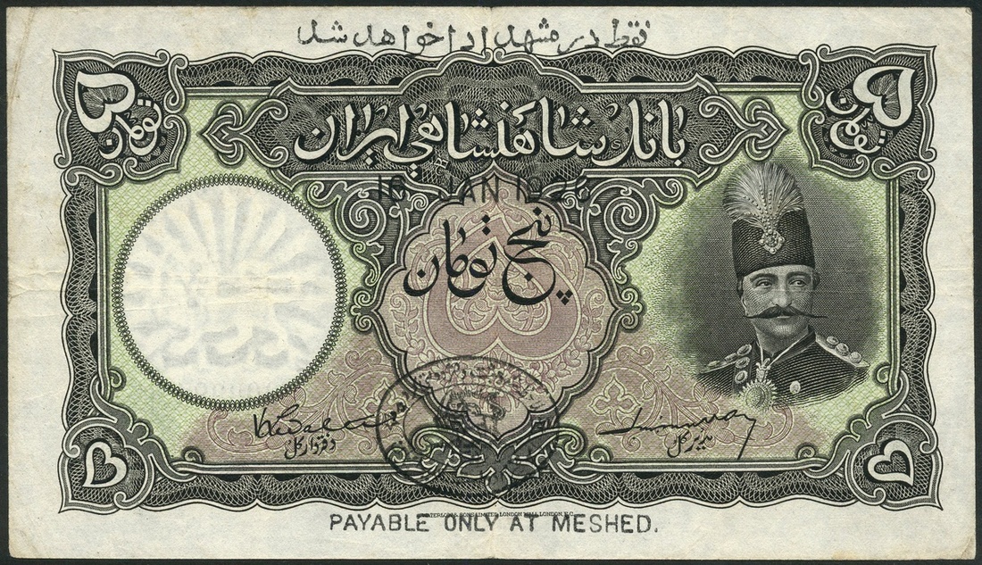 Imperial Bank of Persia, 5 tomans, Meshed, 16 January 1926, black serial number C/K 009994, black and white, green and mauve, Shah Muzaffar-al-Din at left, black oval handstamp low centre, reverse green and white, value