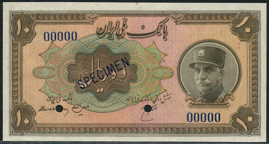 Bank Melli Iran, specimen 10 rials, AH1313 (1934), serial number 00000, brown on multicolour underprint, Shah Reza at right, value at corners, reverse lion with crown and scimitar at centre, two small cancellation holes and blue SPECIMEN overprint
