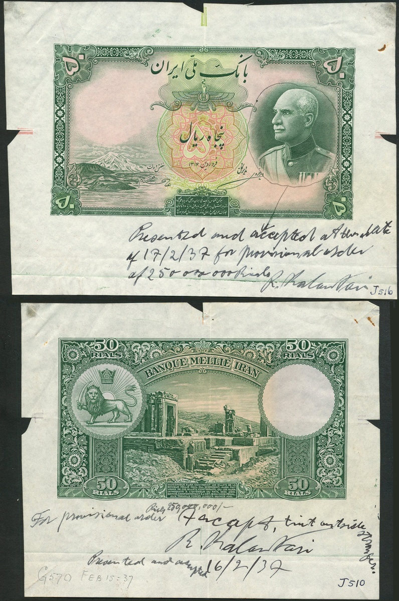 (†) Bank Melli Iran, an obverse and reverse printers archival uniface proof/specimen for a 50 rials, AH 1317/1937, green and pale pink, Shah Reza at right, Mount Damavand at left, reverse green, ruins, arms top left