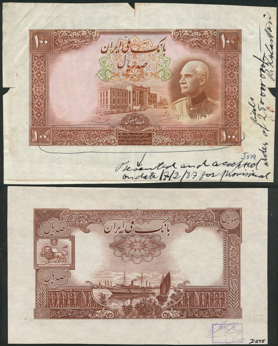 (†) Bank Melli Iran, an obverse and reverse printers archival uniface proof/specimen for a 100 rials, AH 1317/1937, pink-brown and pale green, Shah Reza at right, bank building at centre, reverse pink-brown, yacht at centre, arms top left