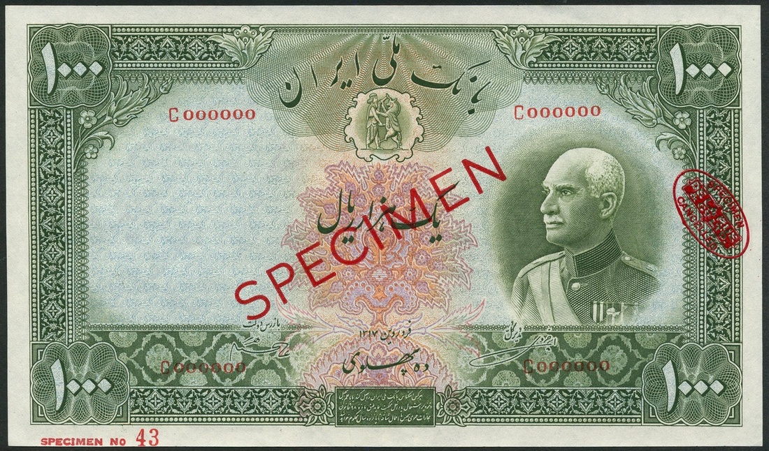 (†) Bank Melli Iran, specimen 1000 Rials, AH1317 (1938), red serial number C 000000, green on multicoloured underprint, three quarters profile portrait of Shah Reza at right, reverse mountain scenery, Persian text,