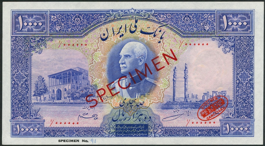 (†) Bank Melli Iran, specimen 10000 rials, AH 1317 (1938), red serial number 1/000000, blue and multicoloured, Shah Reza three quarter facing to left at centre, palace at left, ruins at right, value at each corner, reverse blue and pale green, viaduct, at centre, column at left and right, arms top right