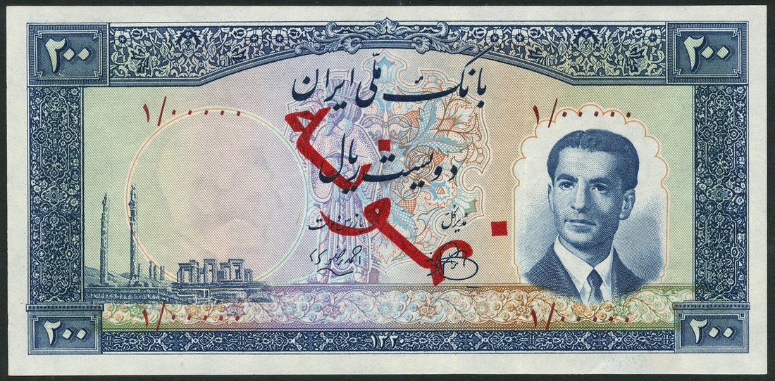 Bank Melli Iran, specimen 10 rials, blue, specimen 20 rials, brown, specimen 50 rials, green and specimen 100 rials, purple, and specimen 200 rials, blue, all SH 1330 (1951), all Shah Pahlavi at right