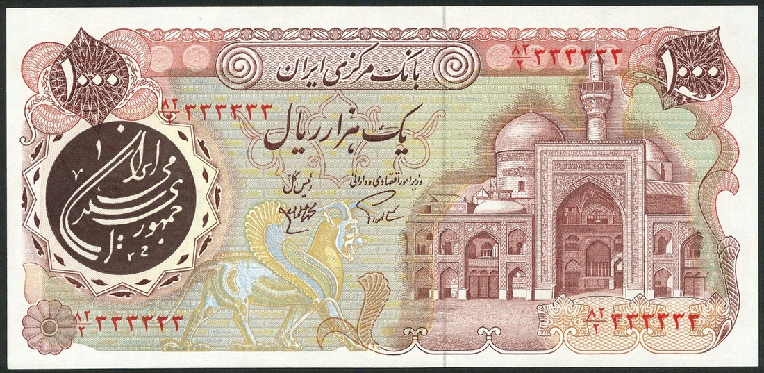 Bank Markazi, Iran, a pair of 500 rials, 1981, serial numbers 54/2 111111/111112, also a pair of 1000 rials with serial numbers 82/2 333333/333334, pink-brown and multicoloured, the Iman Reza Mosque at right