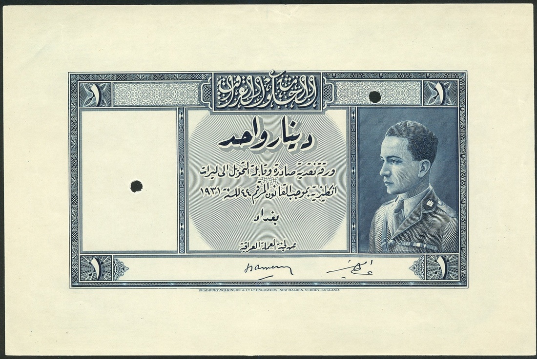 (†) Government of Iraq, an obverse printers archival die proof engraving for a 1 dinar, law of 1931 (1934), blue and white, King Ghazi in military uniform at right, signatures of Amery and Ata Amin low centre