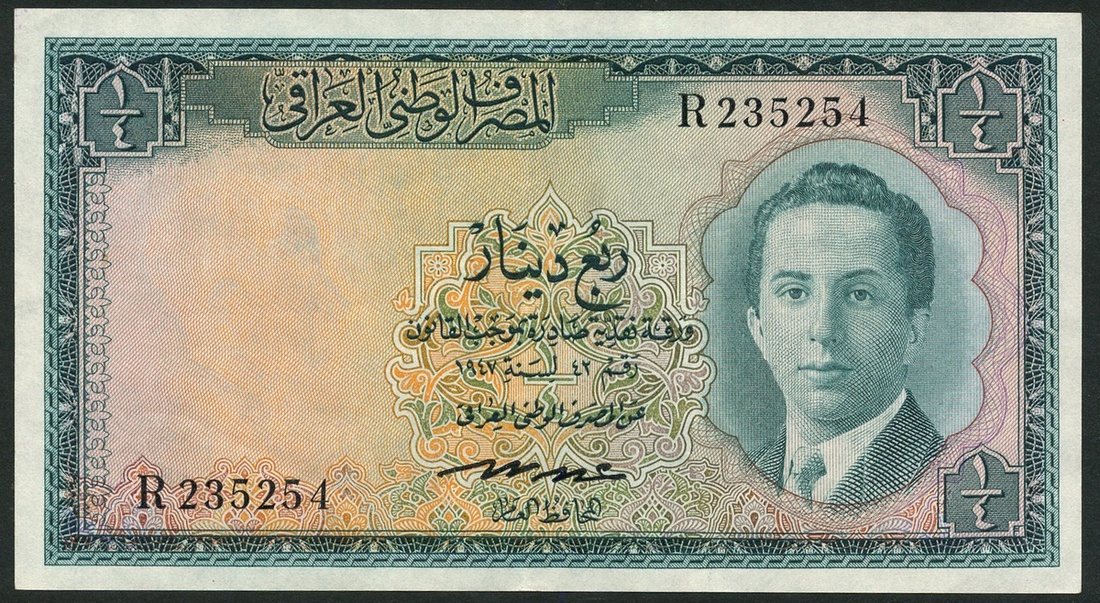 National Bank of Iraq, 1/4 dinar, 1947, serial number R235254, green and multicoloured, King Faisal II as a young man at right, signature of Abdul Ilah Hafudh at low centre, reverse blue-green, palm trees at centre