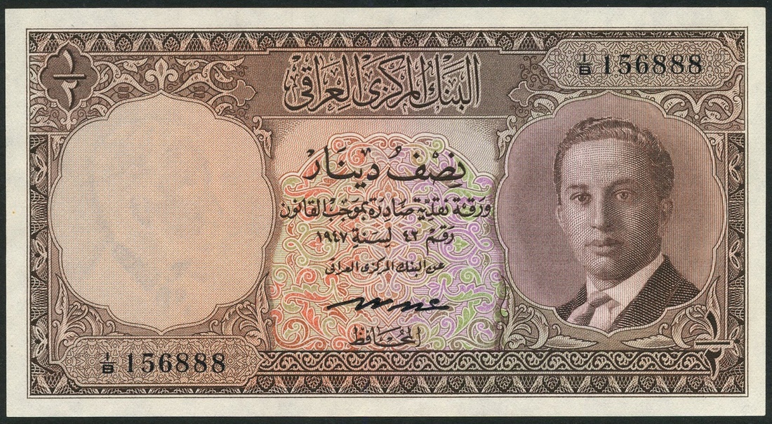 (x) Central Bank of Iraq, 1/2 dinar, law of 1947 (1959), serial number 1/B 156888, brown on multicolour, King Faisal II as young man at right, signature of Abdul Ilah Hafudh, reverse brown, the Great Mosque of Samarra at centre