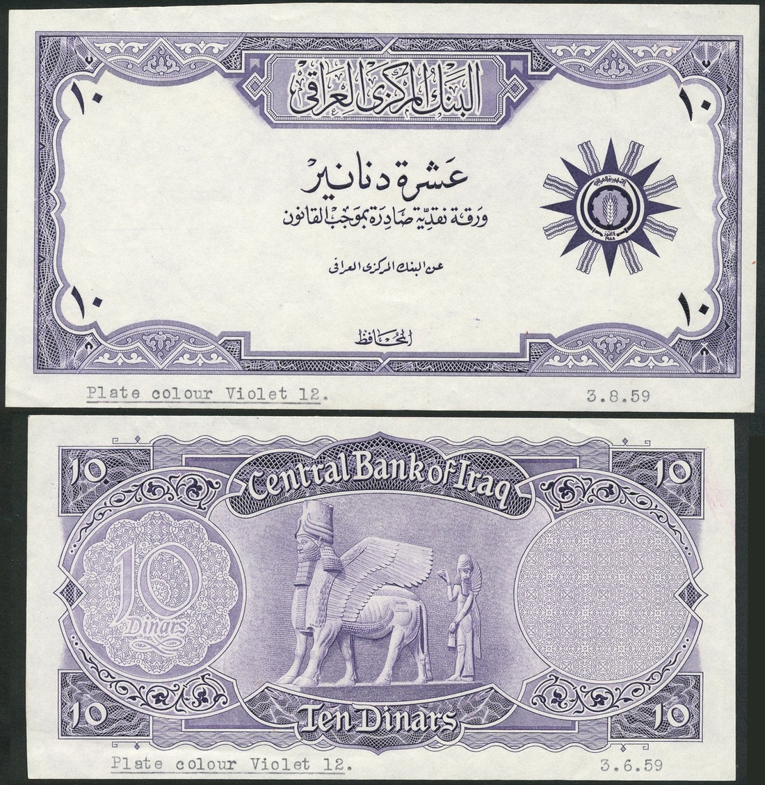 Central Bank of Iraq, obverse and reverse die proofs for 10 dinars, 1959, purple, coat of arms at right, value at corners, reverse purple, winged bull statue at centre, value at left and corners