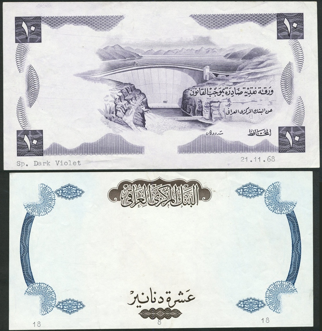 Central Bank of Iraq, obverse partial die proofs (2) for 10 dinars, 1971, first purple, Dukan dam at centre, value at corners, second brown and teal, border only