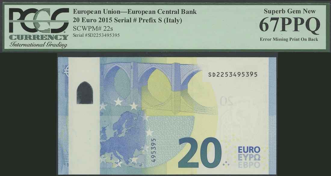 European Central Bank, ERROR: 20 euro, 2015, serial number SD2253495395, European flag at top left, Gothic architecture, value at top centre, reverse Bridge, map, missing Holographic strip and some of print
