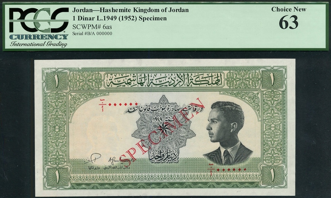 The Hashemite Kingdom of Jordon, specimen 1 dinar, L.1949 (1952), red serial number BA 000000, green on light orange and blue, King Hussein at right, Anestas Hananeyah and Baha Al-Din Toukan signatures, ornate border, reverse, archaeological site at Jerash, column at left and right,