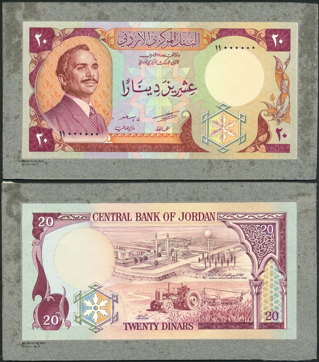 Central Bank of Jordan, hand produced obverse and reverse composite essay on board for 20 dinars, ND (1975), zero serial numbers, red, orange and multicolour, King Hussein at left, reverse, two images showing Power Station and Agriculture,