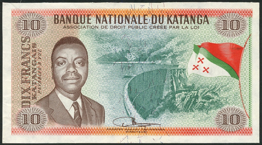 (x) Banque Nationale du Katanga, a 10 francs remainder, 1960, red, green and mauve-brown, Delcommune Dam at right with Katangan flag, Moise Tshombe at left, reverse brown and green, smelting plant