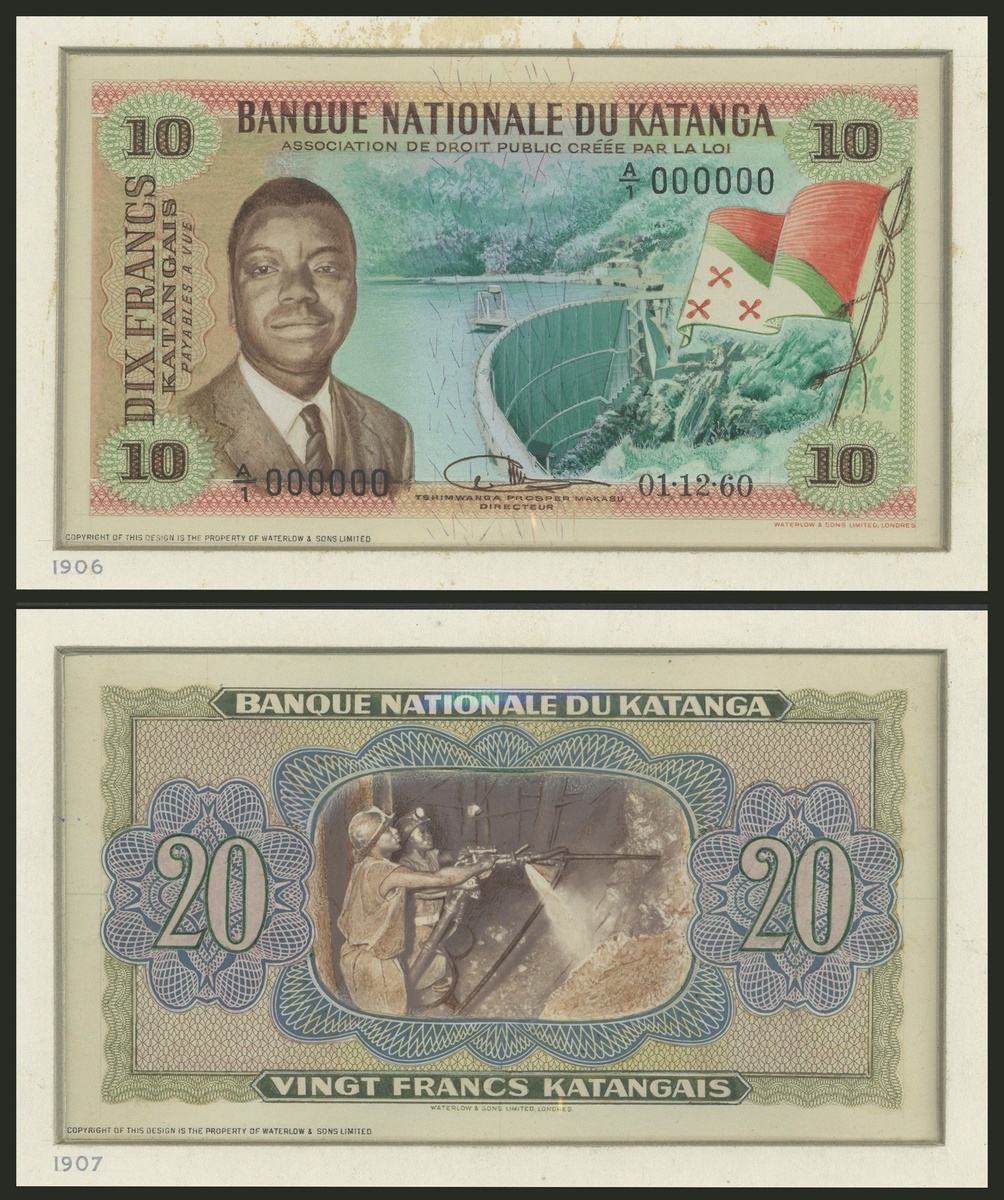 (x) Banque Nationale du Katanga, hand painted essay for a obverse 10 Francs, 1960, prefix A/1, printed date 1.12.60 red and green-blue, Moise Tshombe at left, the Delcommune Dam at right with national flag, also a reverse composite essay for a 20 francs, blue and green, mining scene at centre