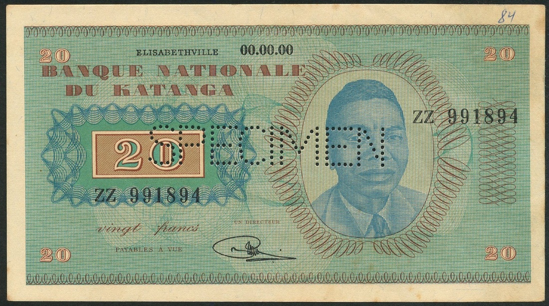 (x) Banque Nationale du Katanga, specimen 20 francs, ND, serial number ZZ 991894, also an issued example dated 21.11.60, with serial number DO 584969, both blue-green and brown, Moise Tshombe at right, value at left
